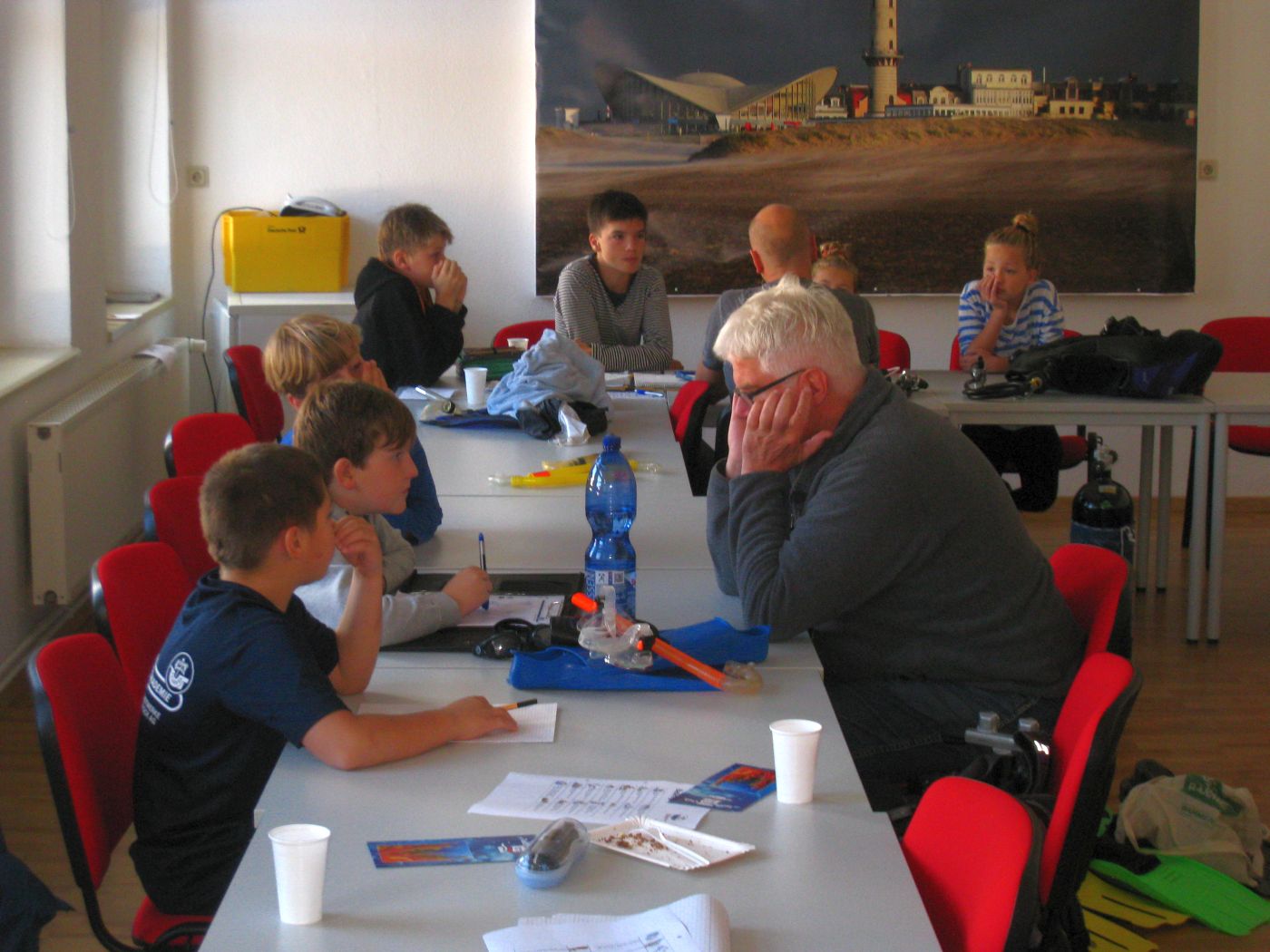 Als sich alle am nächsten Morgen wieder im Schulungsraum trafen war der lange Vortag in mach einem Gesicht zu erkennen aber auch die Vorfreude auf den zweiten Tag des Tauch-Wochenendes. In dem kurzen Theorieteil konnten die Kinder zum Teil schon ihre am Vortag gemachten Erfahrungen einfließen lassen und die Spannung auf den folgenden ausgedehnten Tauchgang im Sprungbecken wuchs.
