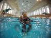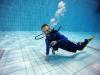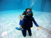 Nach einer kleinen Stärkung im Anschluss und der folgenden Einweisung in die Bestandteile einer Gerätetauchausrüstung, verbunden mit ersten praktischen Erfahrungen beim Zusammenbau und dem Umgang mit der Ausrüstung ging es gemeinsam mit den Ausbildern Torsten, Raik und Hagen am 4,80m tiefen Sprungbecken weiter. Viel Gelächter und Hallo dann beim Anziehen der Tauchanzüge. stellte es sich doch oft als schwieriger heraus als erwartet und auch die Erfahrung des Auftriebs nach dem Sprung ins Wasser war doch für viele Kinder etwas völlig Neues. Hier bekamen wir tatkräftige Unterstützung durch Sven, Gerätewart im Verein. Er half überall beim anlegen und anpassen der Ausrüstung und so konnte noch am Nachmittag jedes Kind eine kleine Runde mit einem Ausbildern im Sprungbecken drehen.