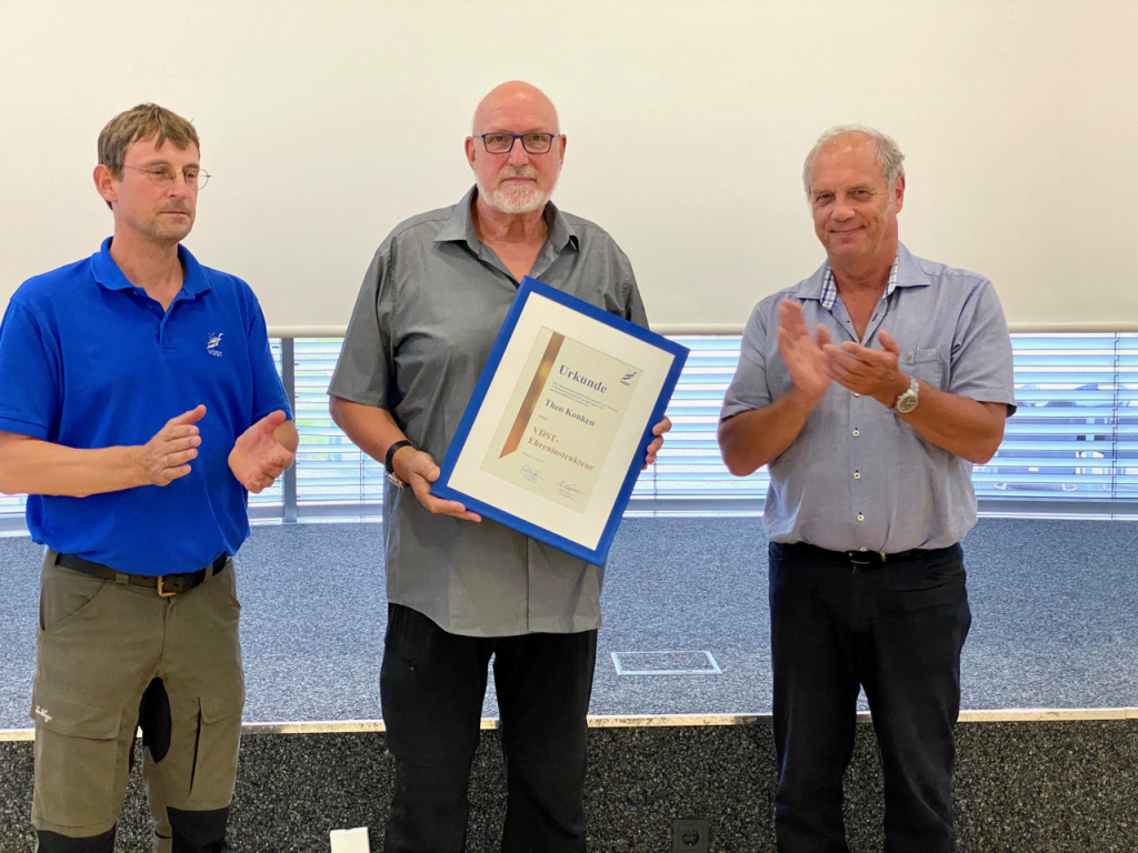 Am vergangenen Wochenende tagten im SportCentrum Kaiserau (NRW) der Stab des VDST-Fachbereichs Ausbildung gemeinsam mit den Ausbildungsleitern der Landesverbände. Mit dabei VDST-Präsident Dr. Uwe Hoffmann. Eine besondere Freude war es ihm am Samstag Abend, Theo Konken und seine Frau Agnes begrüßen zu dürfen. Zusammen mit VDST-Ausbildungsleiter Hagen Engelmann konnte er Theo im Kreis seiner ehemaligen Mitstreiter die Ernennungsurkunde zum VDST-Ehreninstrukteur überreichen. Der VDST ehrt Theo Konken damit für seinen fast zwanzigjährigen, engagierten und erfolgreichen Einsatz als Leiter des Fachbereichs Ausbildung im VDST.