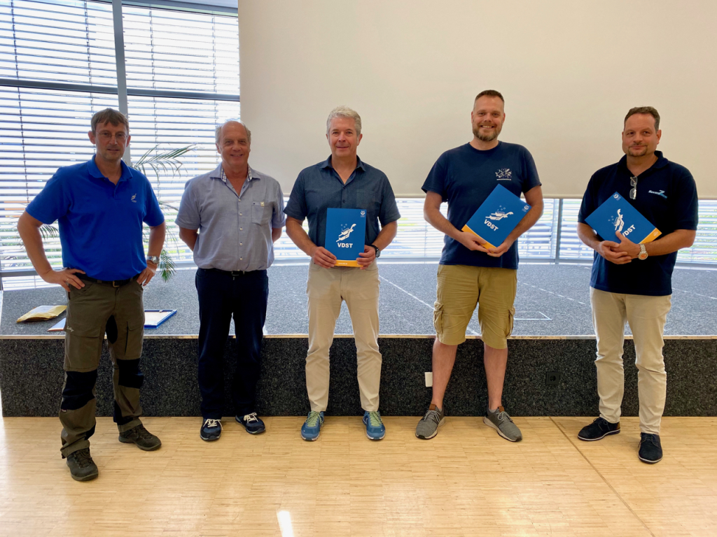 Im Rahmen der Tagung überreichten Uwe Hoffmann und Hagen Engelmann auch die Ernennungsurkunden an die VDST-Instrukteure im Stab des Fachbereichs Ausbildung. Unter ihnen auch erstmals Jan-Martin Manzek, seit 1997 Mitglied im TSC Rostock 1957 und viele Jahre als stellvertretender Landesausbildungsleiter im LTV Mecklenburg-Vorpommern aktiv. Freude und Überraschung bei Jan-Martin aber auch große Freude bei Hagen! War doch die Überraschung gelungen und er konnte seinem Vereinskameraden, Mitstreiter und Freund zum VDST TL4 ernennen. Das die Ernennung zum Instrukteur aber auch mit einer Menge Arbeit verbunden ist, stellte Jan-Martin bereits eine Woche vorher fest, als erstmalig unter seiner Regie die VDST-TL3-Theorieprüfung in Offenbach stattfand.