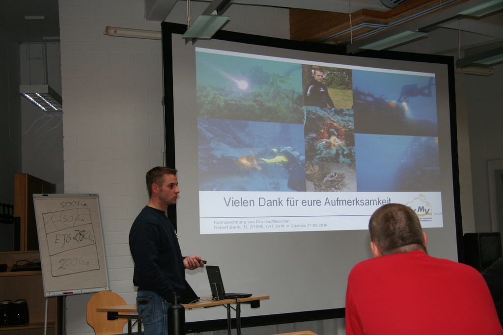 Nach der Begrüßung durch den Landesausbildungsleiter Hagen Engelmann machte Dr. Robert Bank den Anfang und referierte über die aktuelle Kennzeichnung von Druckluftflaschen und gab noch mal den Hinweis, dass es seit dem 01.07.2015 ein neues Gesetz gibt, in dem die genaue Kennzeichnung von Druckluftflaschen präzisiert wurde. Der Gesetzgeber schreibt vor, dass alle Tauchgeräte mit einem zusätzlichen Aufkleber ‚‚Gefährliche Güter‘‘ gekennzeichnet werden müssen. (Info’s: www.vdst.de/tauchausbildung/aktuelles.html)