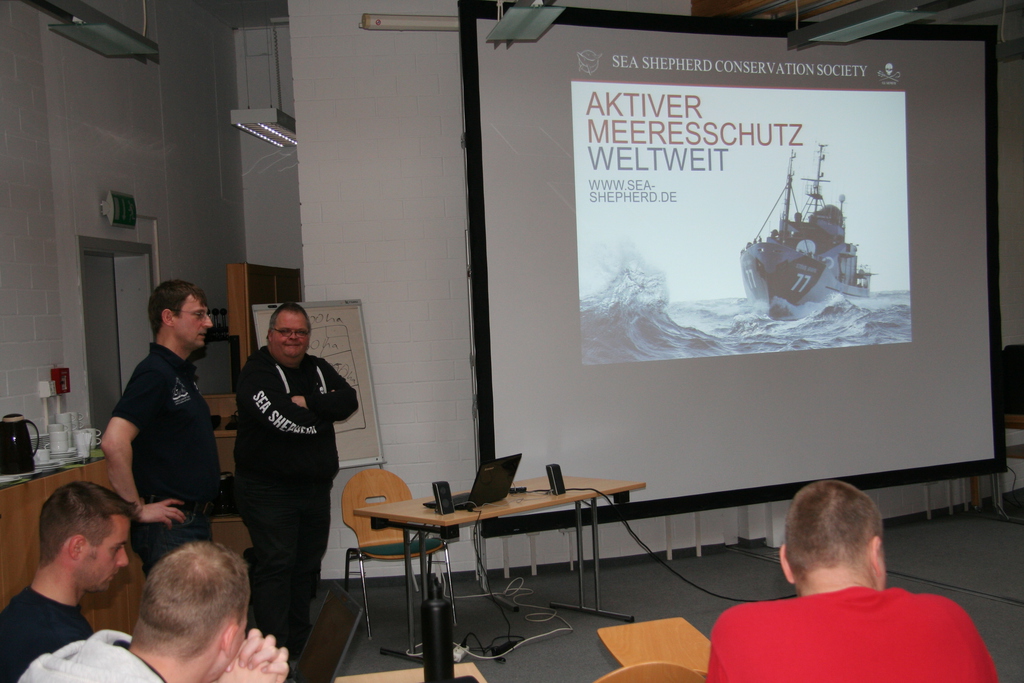 Anschließend sprach Rainer Lenthe von Sea Shepherd zum Motto seiner Organisation “Force the Oceans”. Er vermittelte ein klares Bild seiner Organisation und stellte klar, dass es Sea Shepherd um den Schutz der Meere und den Kampf gegen den illegalen Walfang, die Robbenjagd und die unverhältnismäßige Fischerei geht. Er gab einen Einblick in die Kampagnen von Sea Shepherd. Zum Abschluss zeigte er einen Film, der einen spannenden Eindruck in den harten Kampf gegen die kriminellen Walfänger vermittelte (https://www.youtube.com/watch?v=soxlqX5U2iQ).