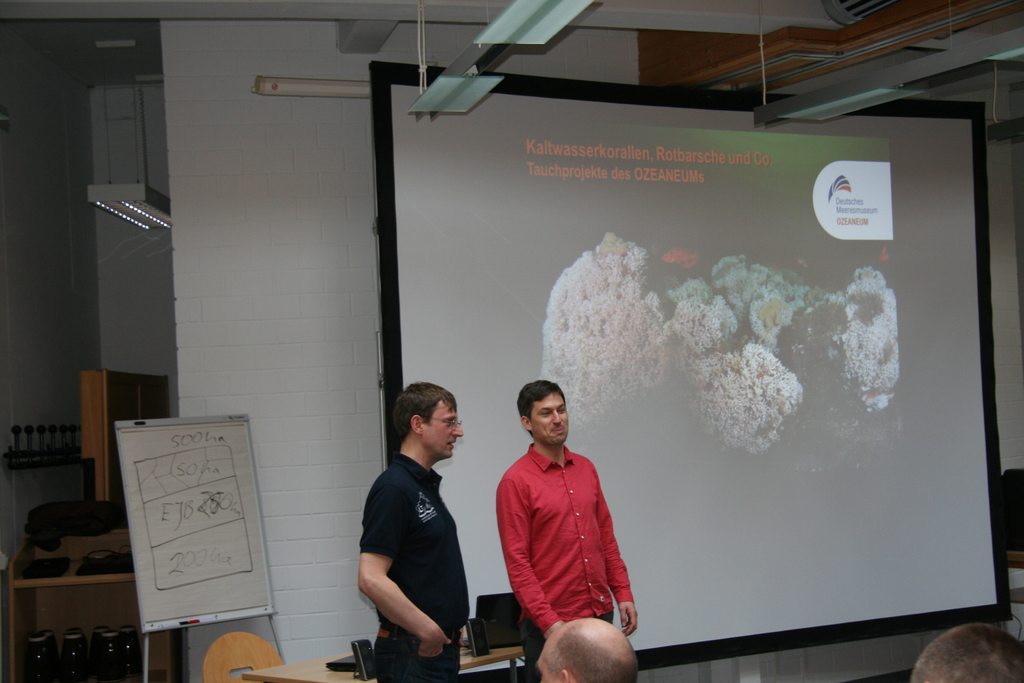 Nach einer kurzen Pause berichtete Henning May, Tauchereinsatzleiter des Ozeaneum Stralsund über die einzelnen Tauchprojekte des Ozeaneum‘s. Dabei ging es genauer gesagt um die Kaltwasserkorallen und charakteristische Fischarten im Atlantik rund um Norwegen. Kaltwasserkorallen kommen meist ab einer Tiefe von 40m vor. Henning May gab auch einen Einblick wie bei Forschungstauchgängen Korallen ,,gepflügt‘‘ und Fische gefangen werden, bevor sie nach Stralsund transportiert werden. Darüber hinaus gab es einen kleinen Einblick wie Tauchgänge in Tiefen bis zu 90m durchgeführt werden. Aufgrund der vielen Dekozeiten dauert so ein Tauchgang meist an die 3 Stunden und kann nur mit bestimmten Mischgasen durchgeführt werden.