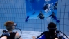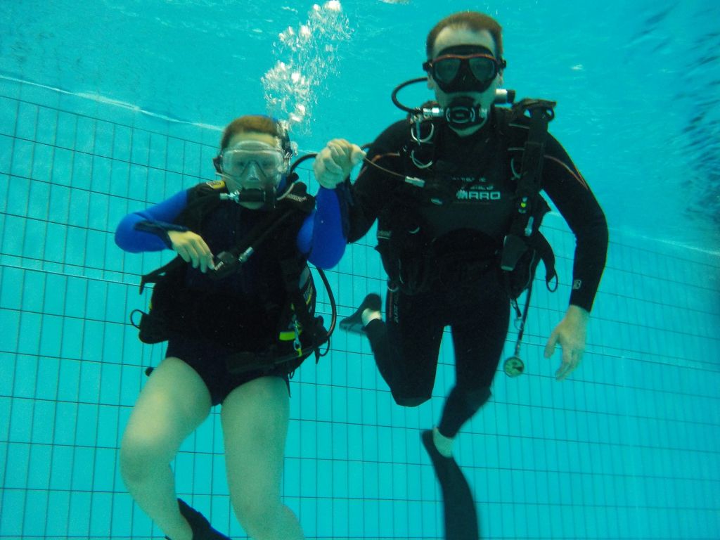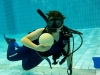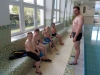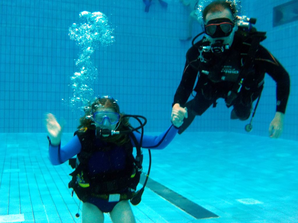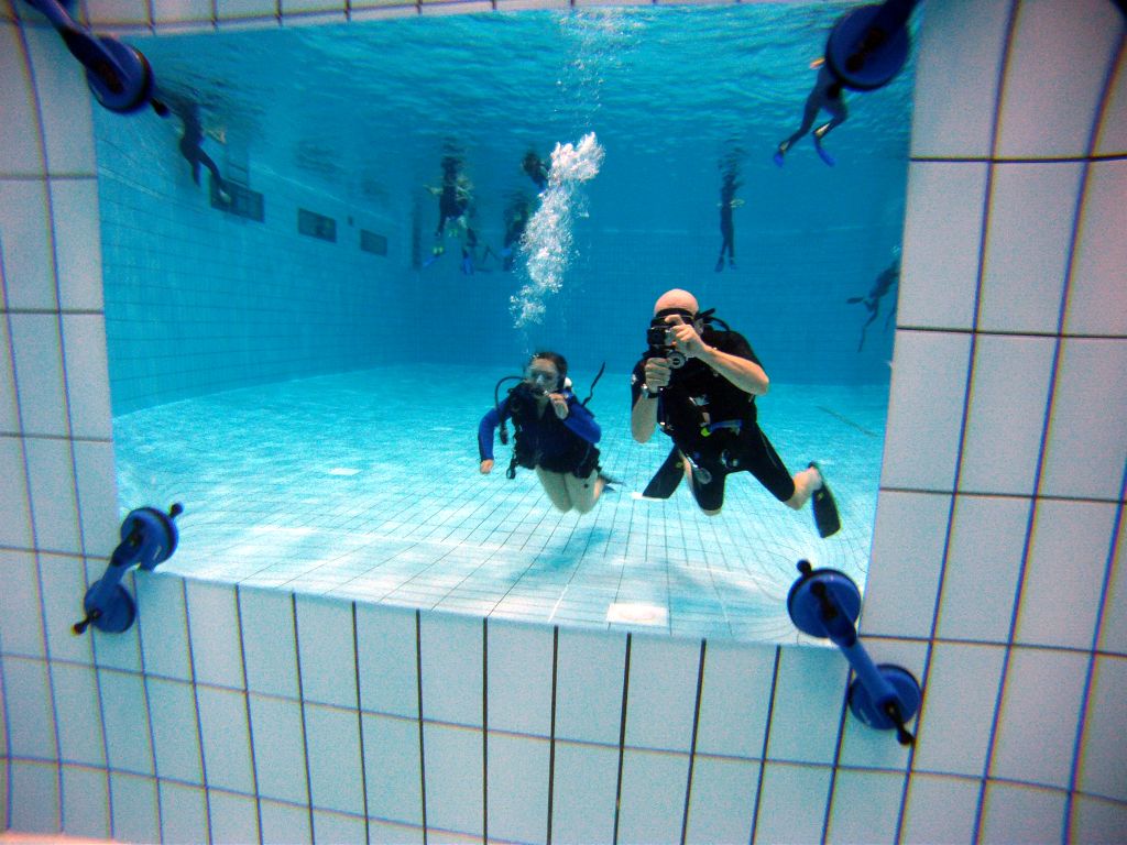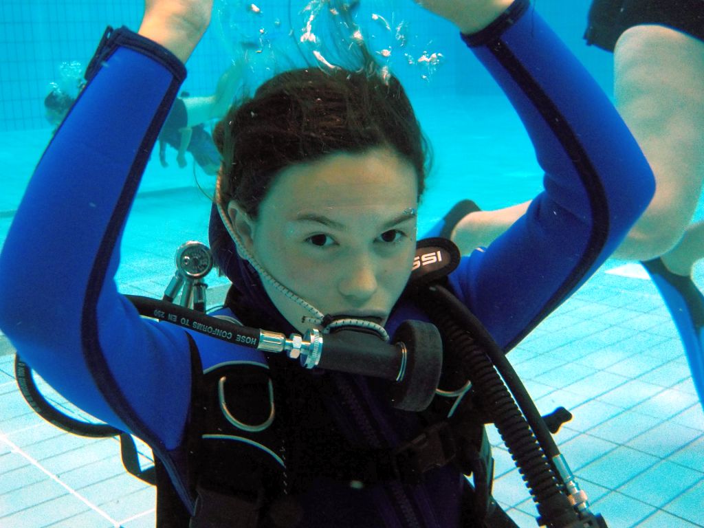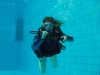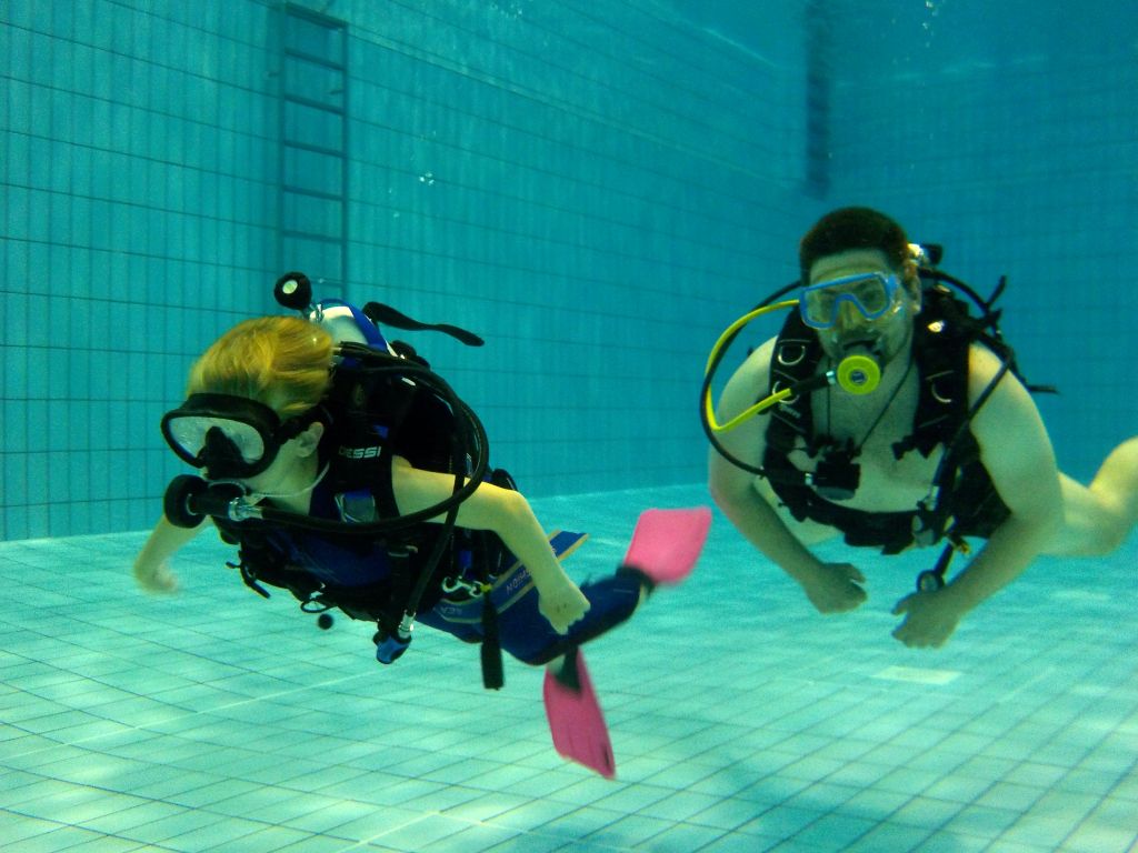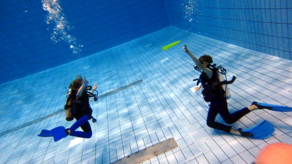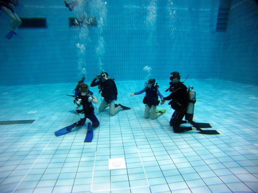 Nach einer kleinen Stärkung ging es im Schulungsraum mit Erklärungen zum Tauchgerät, bestehend aus Druckluftflasche, Jacket und Regler weiter. Hier lernten alle den richtigen Umgang und die Funktion der einzelnen Bestandteile. So vorbereitet konnte es zum zweiten Mal ins Wasser gehen. Diesmal in das 4,80 Meter tiefe Sprungbecken. Unter der 1:1-Betreuung der erfahrenen Tauchlehrer und Übungsleiter konnten alle erste Erfahrungen mit dem Tauchgerät sammeln. Nur die vier KTSA-Schüler hatten mit den ersten Aufgaben unter Wasser zu "kämpfen". Ziemlich erschöpft aber begeistert endete so der erste Tag.