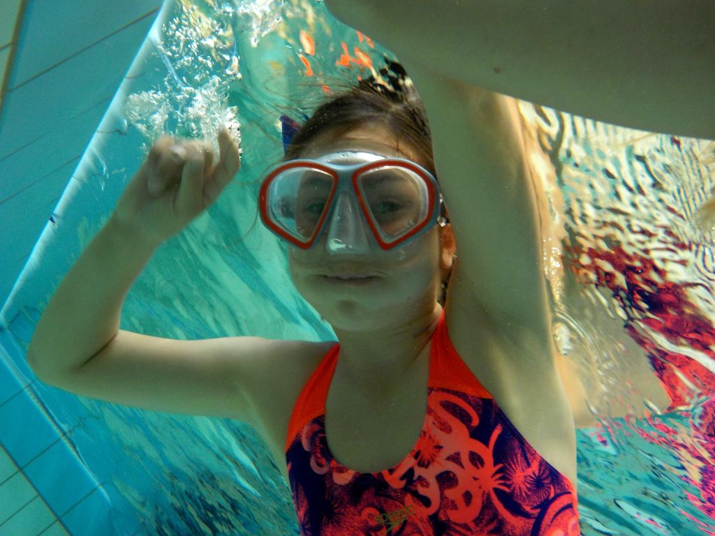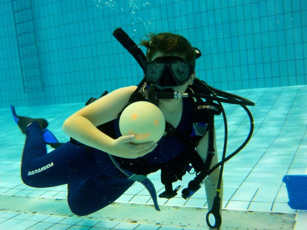 Im Wasser Teil 3 ging es dann für alle nochmal ins Sprungbecken. Mit den Erfahrungen des Vortages fühlten sich alle schon fast wie die Fische im Wasser. Im UW-Spiegel an der Beckenwand konnten sich alle kleinen Taucher erstmals selbst begutachten, um sich dann mit der Vielzahl an UW-Spielzeug zu beschäftigen. So verflog auch hier wieder die Zeit wie im Fluge und der Luftvorrat der 4-l-Flasche auf dem Rücken erreichte langsam den Reservebereich. Zum Abschluss konnten alle nochmal ihren Mut bei Sprüngen vom 3m und 5m-Meter-Brett beweisen.