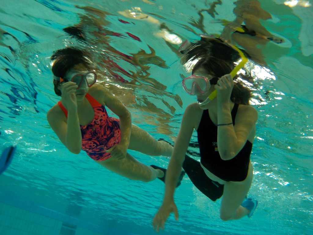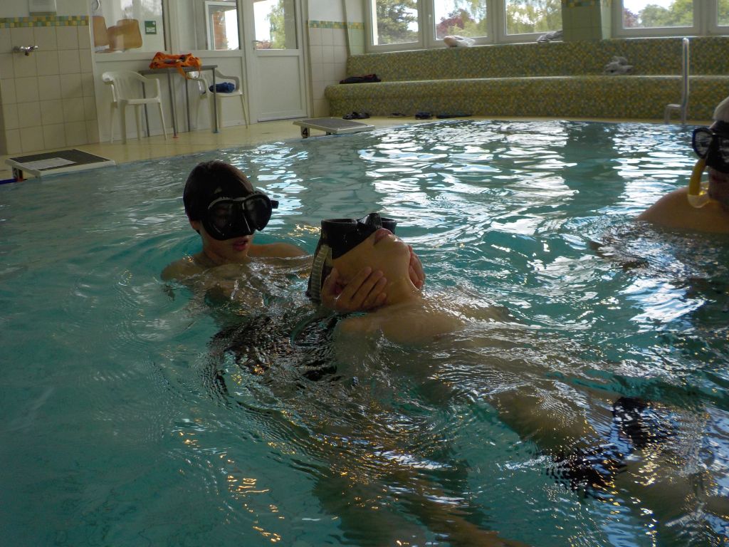 Nach einer kurzen Einweisung aller Kinder und ihrer Eltern am Samstag morgen und der anschließenden Klärung der Voraussetzungen und Formalitäten ging es mit dem ersten der notwendigen Theorieblöcke weiter. Anschließend konnte es endlich ins Wasser gehen. In der Schulschwimmhalle lernten die Kinder den Umgang mit der ABC-Ausrüstung - Flossen, Maske und Schnorchel und absolvierten die Aufgaben für die Schnorchelabzeichen "Otter" und "Robbe" sowie das KTSA. Mit den Aufgaben und etwas Zeit zum Spielen waren die zwei Stunden wie nix verflogen.