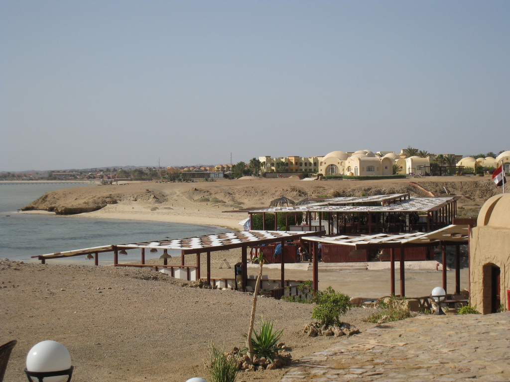 Das „Shagra Village“ ist genau auf unser Hobby Tauchen zugeschnitten. Rezeption, Tauchbasis, kleiner Andenkenladen, Cafe, Restaurant und Unterkünfte – fertig, fast, beinahe hätte ich das Rote Meer mit dem scheinbar unendlichen Riff vergessen. Es stehen verschiedene Unterkünfte zur Auswahl, sowohl einfache und komfortablere Zelte oder Chalets. Die Zelte stehen direkt am Strand, keine 50 Meter vom Wasser entfernt, die Chalets in einem weiten Bogen aufgereiht. Die Ausstattung ist spartanisch zu nennen, außer zwei Betten gab es noch je einen Nachttisch, Schreibtisch, Hocker, Kühlschrank, Schrank mit Safe, Wasserkocher und sage und schreibe zwei Tassen! Um es nicht zu verheimlichen, unser erstes Chalet hatte sogar einen Fernseher, dafür gingen weder Safe noch Klimaanlage und die Tür öffnete sich erst nach langem Kampf. Das mag sich anhören als wären wir mit unserer Wahl nicht zufrieden gewesen aber das Gegenteil ist der Fall. Schlafen Essen Tauchen - darum drehte sich unser Aufenthalt. Gut - schlafen war nicht immer einfach, das lag zum großen Teil an den wenigen "Landlebewesen" der Gegend, kleine blutrünstige Mücken mit aggressivem Summen. Dafür waren Frühstück, Mittag und Abendessen abwechslungsreich und wohlschmeckend, der Nachtisch war das i-Tüpfelchen... Hier möchte ich auch gleich das überaus aufmerksame und freundliche Personal erwähnen, immer gut gelaunt und so flink, dass man es sich genau überlegen musste, das Besteck auf den Teller abzulegen.
