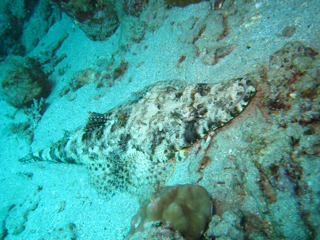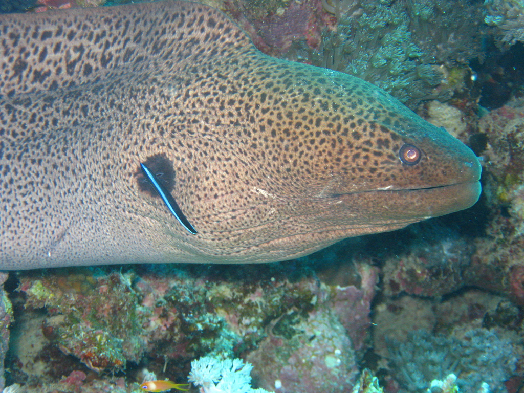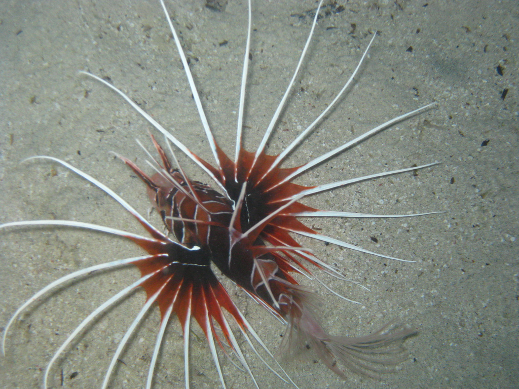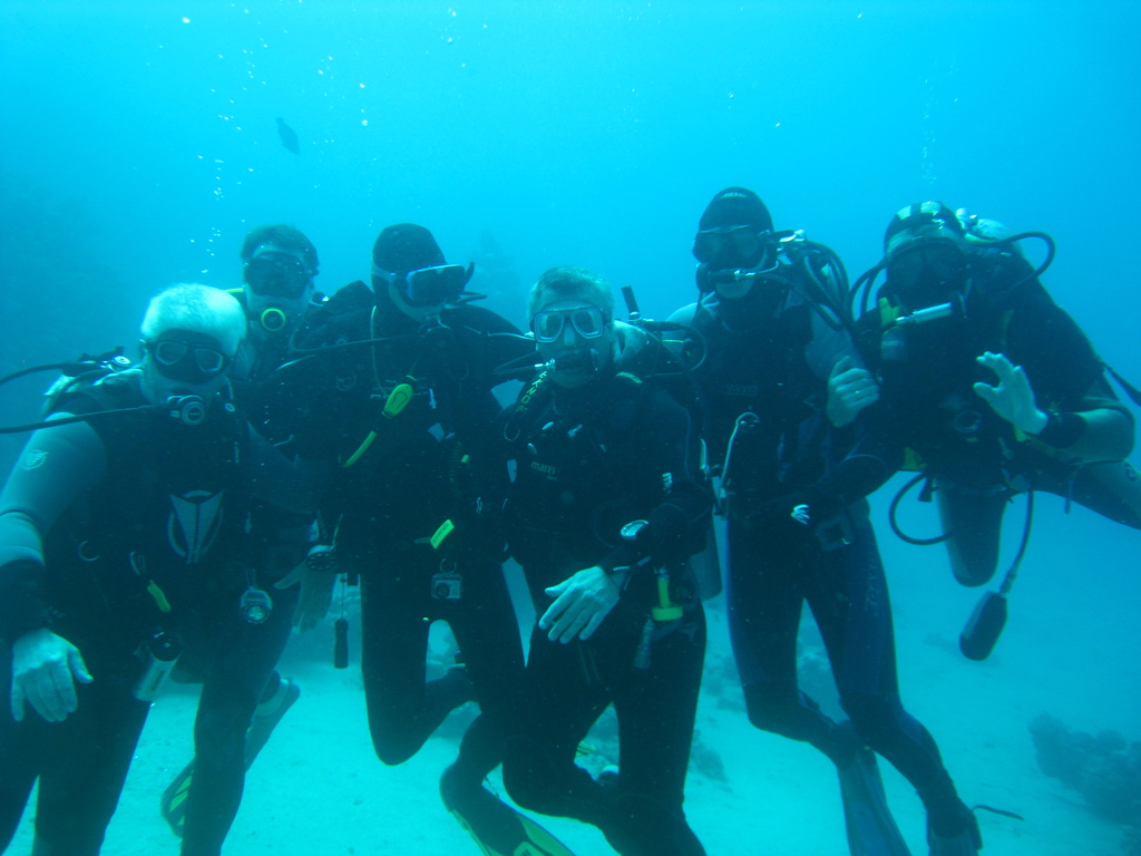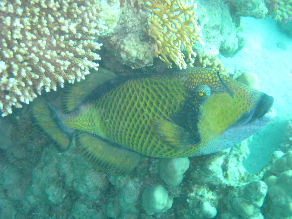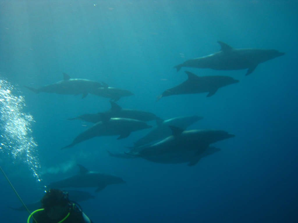 Highlights - berichte ich Freunden und Kollegen von der Reise werde ich immer nach "dem" Höhepunkt gefragt, aber den gibt es für mich nicht. Die Mehrheit der Reisegruppe wird wahrscheinlich das Ereignis am Ende des letzten Tauchganges als Highlight nennen. Wir hatten bereits die Bojen gesetzt, als meine Tauchgruppe völlig aus dem Häuschen geriet. Alle zeigten aufgeregt in meine Richtung - und ich hatte die Befürchtung, das Schlauchboot ist im Anmarsch und ich wäre zu dicht unter der Oberfläche... Zu meinem Erstaunen erblickte ich hinter mir jedoch kein Schlauchboot sondern eine große Gruppe Delphine!!! Elegant und unbeschreiblich schnell zogen sie an uns vorüber... Auftauchen, ins Schlauchboot und hinterher... erfolglos, keine Chance die flinken Tiere einzuholen. Wieder ins Boot, wieder hinterher - überholen und abtauchen - da kommen sie!!! 18 Delphine, teilweise Mütter mit Jungtieren, tauchen erneut unter uns durch. Abends erfahre ich, dass diese Treffen durchaus etwas besonderes ist, ABU Torsten hat schon mehrere 100 Tauchgänge ohne einen einzigen Delphin absolviert, für mich war es erst der 39. Aber auch die 11 vorangegangenen Tauchgänge waren durchaus interessant und erlebnisreich. Wo soll ich anfangen, was ist vielleicht nicht so aufregend? Blaupunktrochen, Feuer-, Lion-, Kugel-, Flötenfische, Nemos... Muränen, richtige Prachtexemplare, vor denen sogar Maradona Respeckt hatte, Diademseeigel bei meinem ersten (!) Nachttauchgang, ausgewachsene Schildkröten, Gitarrenhai, Napoleonfisch - Leute fahrt alleine hin, es ist eine Wucht. Ach-so, ein Tip an alle Einstern-Taucher, 90 Prozent könnt ihr direkt am Hausriff bzw. bei einfachen Tauchgängen sehen. Für schwierigere Spots sind allerdings 50 Tauchgänge und Zweistern Voraussetzung um z.B. dem Hammerhai die Zähne zu zeigen.