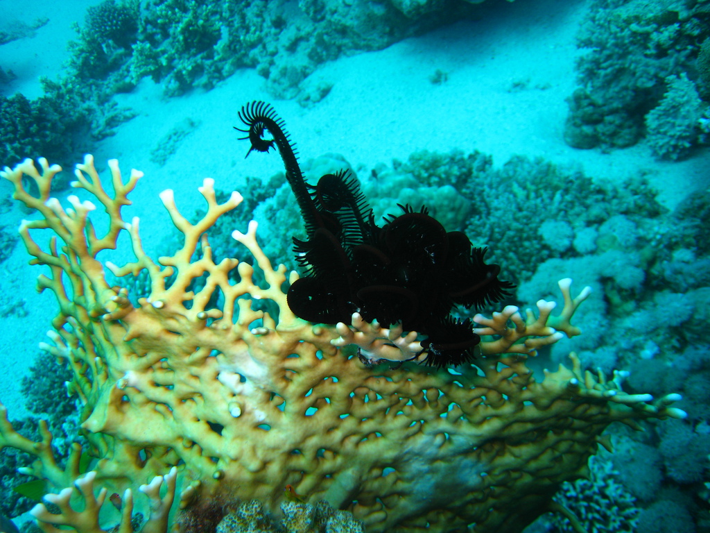 Im Gegensatz zu den "alten Hasen" war ich das erste Mal am bzw. im Roten Meer und eine Erfahrung war die doch recht erhebliche Bleimenge. Tauche ich in der Ostsee benötige ich 8 Kilo, im Roten Meer dagegen 14, zwischenzeitlich sogar 16 Kilo!!!! Wichtig war auch Maradonas Hinweis eine 15 Liter Flasche zu nutzen, da mein Luftverbrauch - untertrieben gesagt - überdurchschnittlich ist. Aber genug der Vorrede, im Gegensatz zu der bereits erwähnten Eintönigkeit an Land ist das Leben unter Wasser unglaublich vielfältig, es gibt nicht nur Fische in den unterschiedlichsten Größen, Formen und Farben auch die Korallen bieten Abwechslung ungeahnten Ausmaßes. Die Farbpalette reicht von weiß, gelb, rosa, grün, blau, braun bis schwarz, die Aufzählung ist mit Sicherheit nicht vollzählig. Ob Weich- oder Hartkoralle, auch die Formen sind vielfältig - von filigran über kräftig bis zu massiv. Ich hatte beim Tauchen mehrfach den Eindruck über die Korallenriffe zu "fliegen", Fische vor, über, unter, hinter und neben mir....