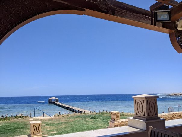Bild 1: Blick aus dem Freiluftrestaurant auf den Einstieg zum Hausriff. Foto: Andreas Schubert