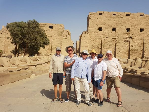 Drei Tauchgänge am Tag sind leistbar aber drei bis vier Tempel oder Pharaonengräber auch. Die Rostocker Tauch- und Kulturreisegruppe komplett und gut gelaunt. Hinter uns der Karnak-Tempelkomplex. Wir stehen quasi auf dem Zuweg zum früheren Bootsanleger, der Nil wurde ja durch den Assuan-Staudamm viel schmaler.