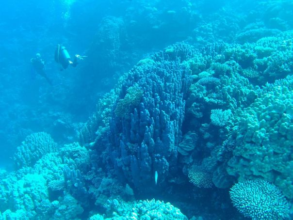 Das Hausriff ist sehr abwechslungsreich. Im nördlichen Teil der Bucht befindet sich eine schöne Riffkante mit einigen Einschnitten und Überhängen. Auf der Südseite, zu der man mit dem Zodiak gebracht wird, befinden sich einige Canyons und Tunnel, die man aber auch ohne Höhlenerfahrung gut durchtauchen kann, denn es ist immer gute Sicht und das Ende nicht verfehlbar. Die vorhandenen Korallen sind in einem recht guten Zustand. Es gibt natürlich aber auch viele abgestorbene Bereiche wie überall, nicht nur im Roten Meer.