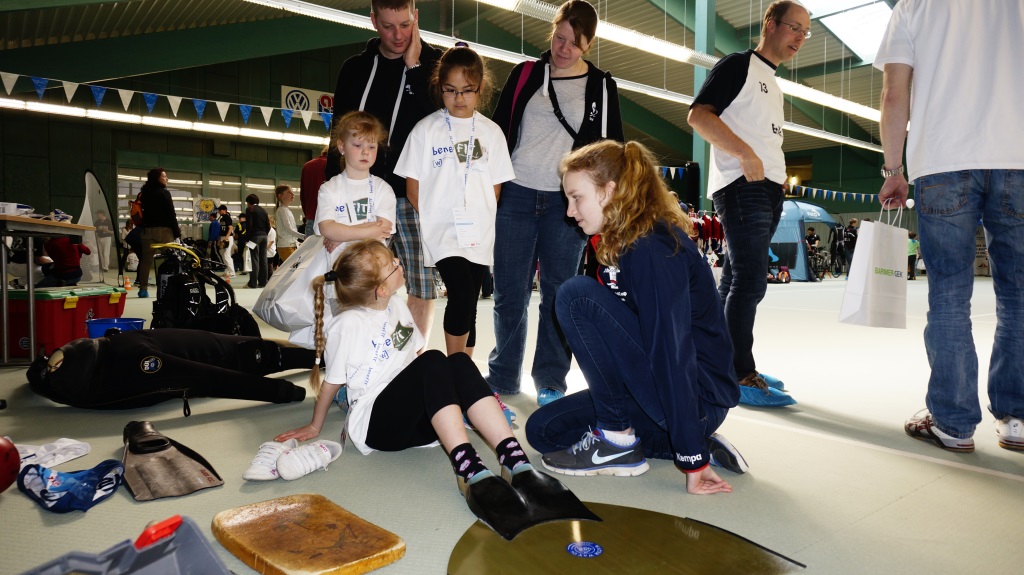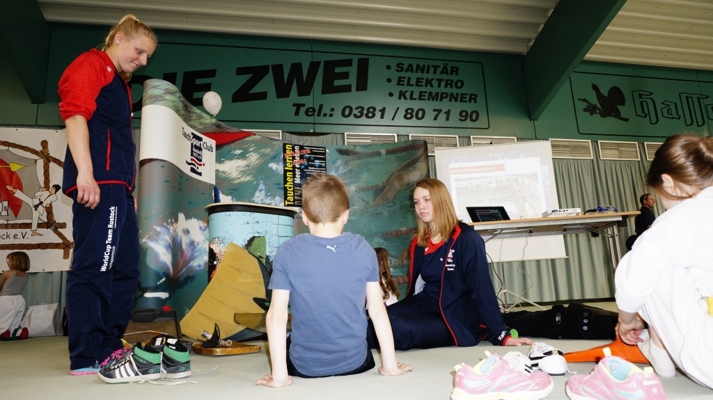 Neben einer Foto- und Videopräsentation hatten wir verschiedene Ausrüstungsgegenstände mitgebracht, die von den Kindern interessiert betrachtet und z.T. auch ausprobiert wurden. Wir hoffen, einige der Gäste zu einem Probetraining in der Schwimmhalle begrüßen zu können. Dazu wird sicherlich auch der Beitrag in der Ostseezeitung beitragen, in dem der TSC neben zwei anderen Vereinen hervorgehoben wurde.