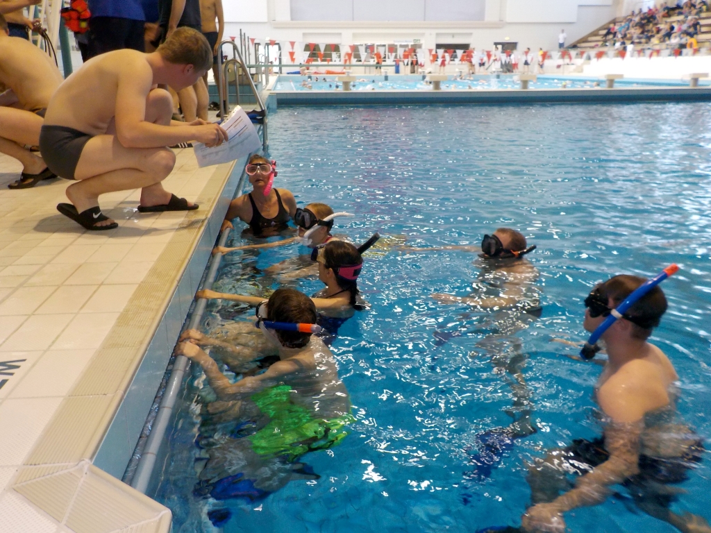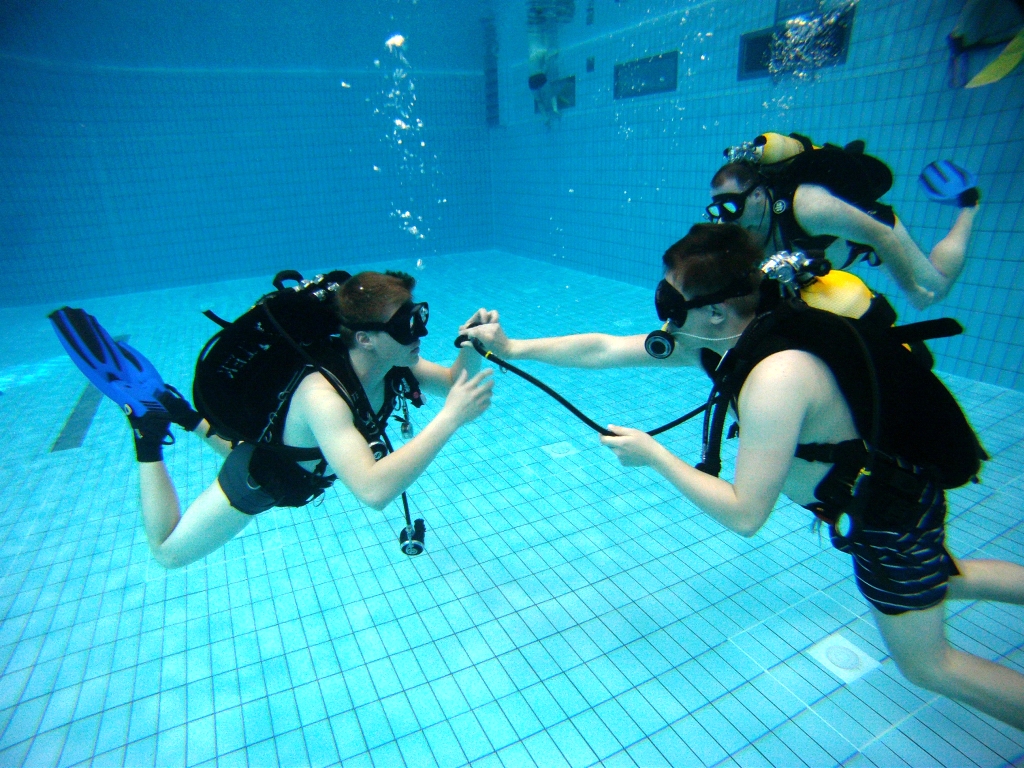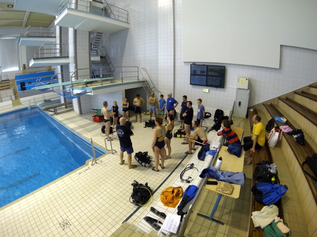 Nun gestalltete sich an zwei Wochenende im April ein spannendes Programm aus Theorie und Praxis. Die zu besprechenden Themen waren vielfältig und aus den unterschiedlichsten Bereichen: Tauchphysik, Tauchmedizin, Tauchtechnik, Organisation und Sicherheitsbestimmungen. Zum Glück gab es immer wieder auch ausreichend Zeit Gelerntes gleich in die Praxis umzusetzen und erste Erfahrungen unter idealen Bedingungen im 4,80 Meter tiefen Sprungbecken unter Aufsicht erfahrener Ausbilder zu sammeln. Neben den ersten Übungen mit dem Tauchgerät kam das Konditionstraining und Überungen mit Flossen, Maske und Schnorchel dazu. So waren die Tage gut gefüllt und alle waren am Ende besten vorbereitet für den ersten Tauchgang im Freiwasser.